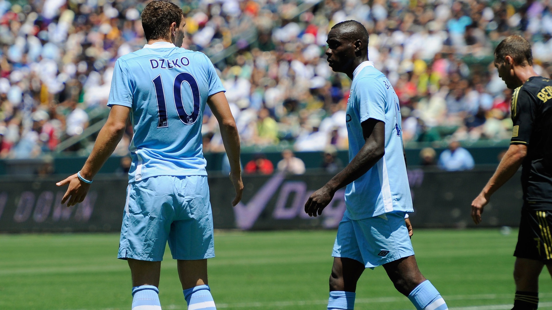| Đánh gót coi thường đối thủ: Trong trận gặp LA Galaxy ở chuyến du đấu trước mùa giải 2012/13, Balotelli có cơ hội rất ngon ăn trong vòng cấm đối phương. Tuy nhiên, thay vì tung ra cú sút, Super Mario lại quay lưng đánh gót nhẹ nhàng đưa bóng ra ngoài. Kết quả là Balotelli bị Dzeko mắng cho một trận, còn HLV Mancini quyết định rút anh ra nghỉ ngay sau tình huống xúc phạm đội bạn. |