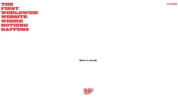 11. Nhấn mạnh đến khẩu hiệu "nghỉ giải lao", KitKat đã tạo ra hẳn một trang web có địa chỉ thefirstworldwidewebsitewerenothinghappens - nghĩa là "trang web đầu tiên trên thế giới chẳng có gì xảy ra". Điều thú vị là khi nhìn vào dòng nhắn nhủ dưới cùng của nó, bạn sẽ bắt gặp dòng chữ: "Nếu bạn thấy có gì diễn ra trên website này, đó có thể là một lỗi hệ thống và hãy báo cho chúng tôi để được nhận thưởng".