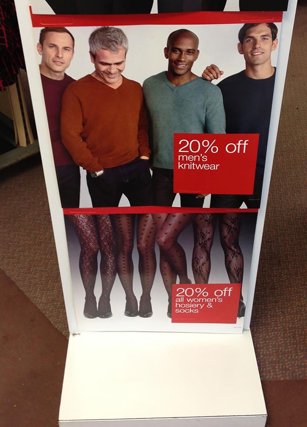 | Quảng cáo thời trang cho nam giới và những chiếc tất chân của phụ nữ tạo nên hình ảnh vô cùng hài hước. |