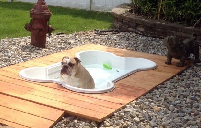 | Chú chó này đang tỏ ra thư thái tận hưởng làn nước mát trong chiếc bể bơi hình khúc xương dành riêng cho mình. |