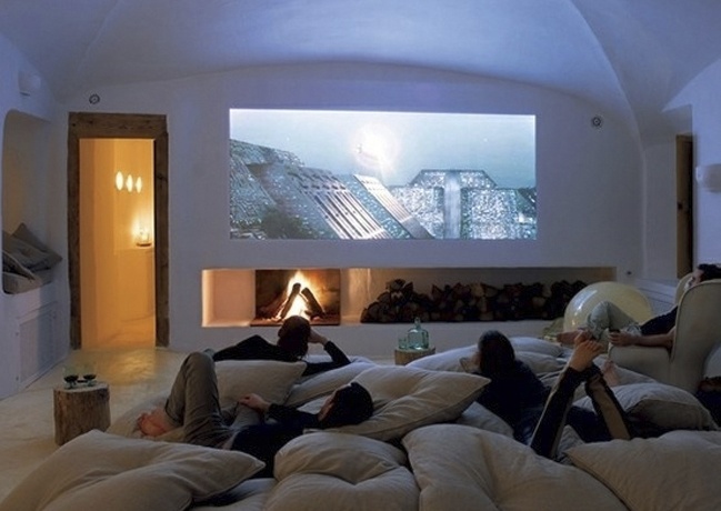 | Căn phòng được biến thành phòng chiếu phim, nơi bạn có thể ngủ quên trên những chiếc đệm ấm áp. |