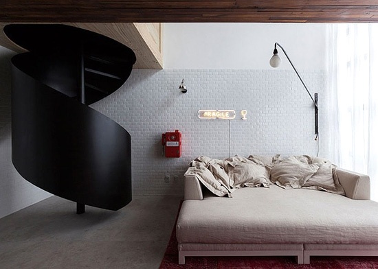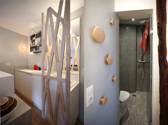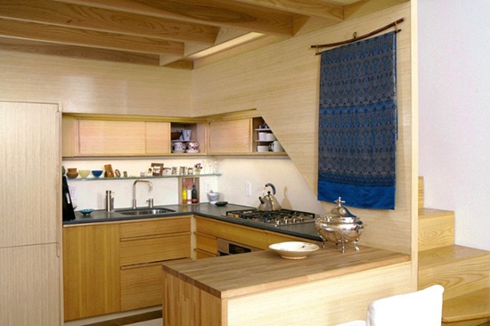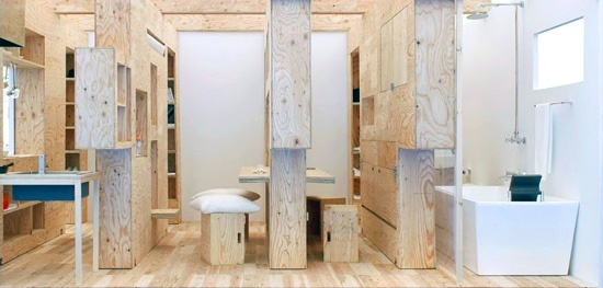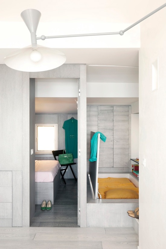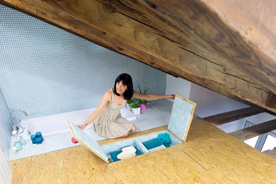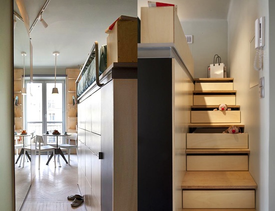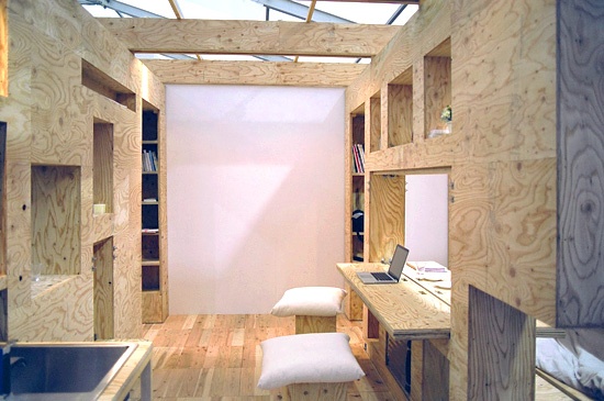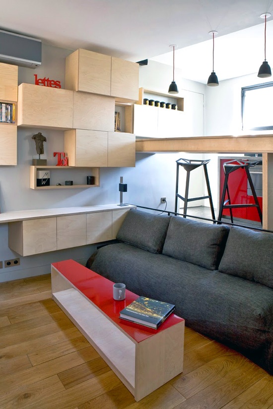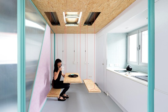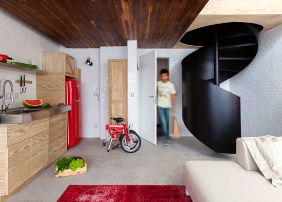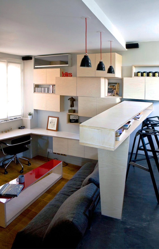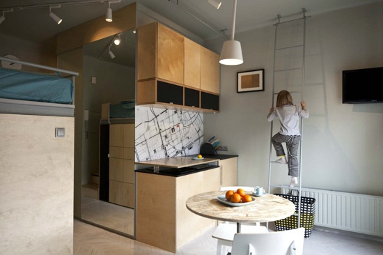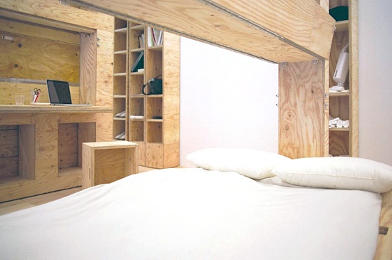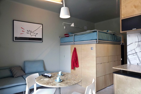 Chỉ có diện tích 12 m2, căn phòng này vẫn có đủ chỗ làm việc, phòng bếp, phòng tắm và giường ngủ có thể cuộn lại cho một người. Để tiết kiệm không gian, mỗi chiếc bàn hay ghế ngồi đều có khoang cất đồ bên trong.