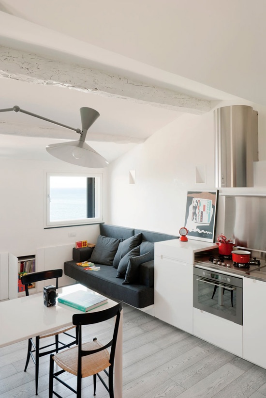 Căn nhà tại một làng chài ở Italy này được thiết kế hết sức thông minh để tận dụng tối đa diện tích 35 m2. Tại đây, bạn sẽ tìm thấy 2 phòng ngủ, một studio, một phòng khách, nhà tắm và cả bếp ăn. Trong đó, mỗi phòng đều có thêm các không gian ẩn để chứa đồ.