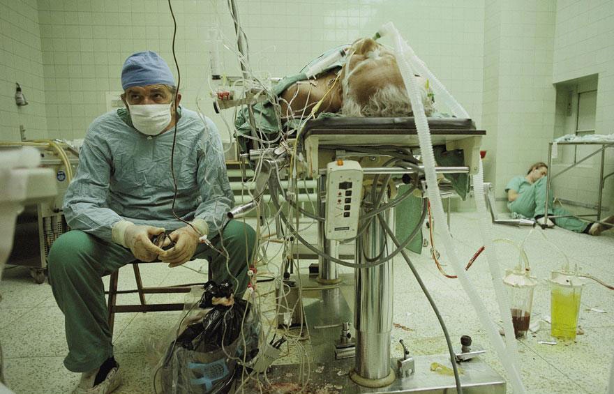 | Một bác sĩ và y tá tỏ ra mệt mỏi sau khi thực hiện ca phẫu thuật tim trong 23 tiếng cho một bệnh nhân. Ca phẫu thuật đã thành công Ảnh: James Stanfield |