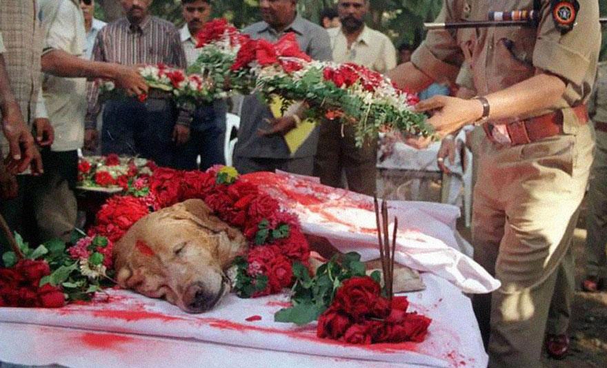 Zanjeer là chú chó cảnh sát cứu hàng nghìn tính mạng trong vụ đánh bom hàng loạt ở Mumbai, Ấn Độ năm 1993, bằng việc phát hiện hơn 3.329 kg thuốc nổ, 600 kíp nổ, 249 quả lựu đạn và 6406 viên đạn. Năm 2000, Zanjeer chết vì chứng sưng phổi và ung thư xương. Tang lễ của chú diễn ra trang trọng với sự chứng kiến của nhiều quan chức cảnh sát cấp cao. Ảnh: Reuters