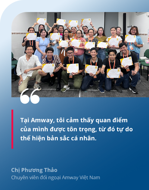 “Công ty luôn chủ động lắng nghe và trao cơ hội phát triển công bằng cho tất cả nhân viên. Amway là nơi tôi được học hỏi, sáng tạo trong công việc, bứt ra khỏi vùng an toàn, kết nối với những thành viên có chung mục tiêu, nâng cao năng lực để phục vụ cho lộ trình phát triển của bản thân”, chuyên viên đối ngoại của Amway Việt Nam nói thêm.