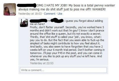 Một nhân viên nữ đã bị mất việc sau khi chỉ trích cấp trên qua Facebook, rằng ông ta là tên đần luôn bắt cô làm những thứ vớ vẩn khiến cô tức điên. Điều đáng nói là sếp cô sau đó đã vào bình luận và nói rằng, cô không cần phải đến làm việc ngày hôm sau.