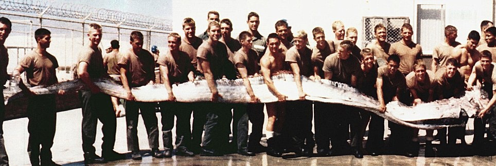 | Hải quân Mỹ chụp ảnh cùng con cá mái chèo dài 7 m. Năm 1996, một nhóm Hải quân Mỹ bắt được con cá mái chèo này tại bờ biển Coronado gần San Diego, California. |