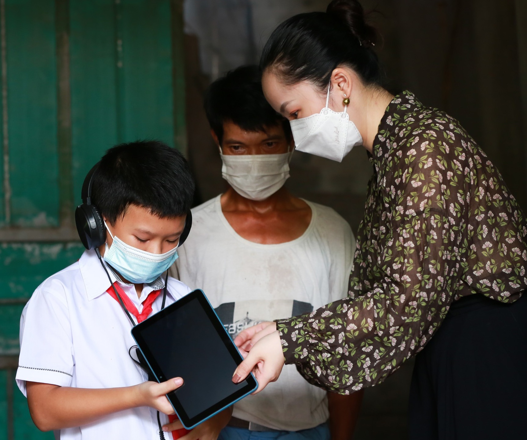 | Các em học sinh khó khăn ở Hà Nội nhận máy tính bảng, điện thoại để học trực tuyến. Ảnh: HTV. |