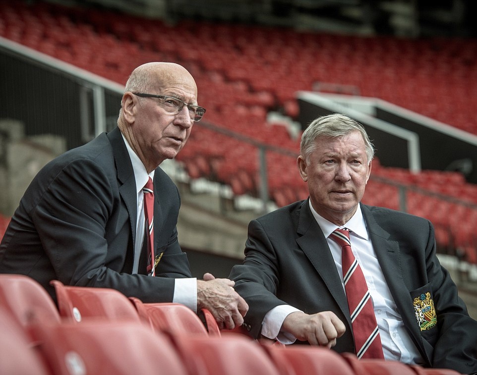 Sir Alex và Sir Bobby Charton trên khán đài Old Trafford năm 2013.