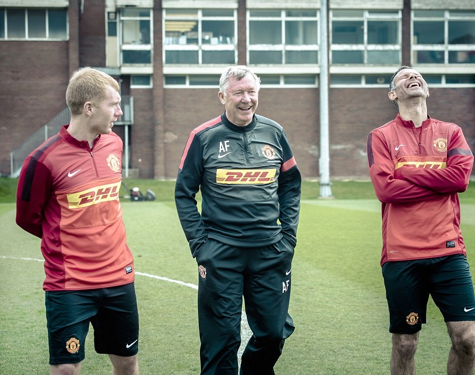 Chiến lược gia vĩ đại nhất trong lịch sử bóng đá Anh nói chuyện phiếm với hai cậu học trò ưu tú Paul Scholes và Ryan Giggs trên sân tập vào tháng 4/2013.