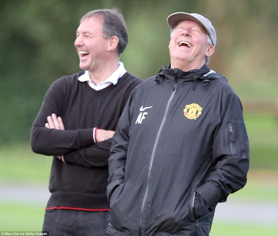 Chiến lược gia 72 tuổi cười tươi bên cạnh cậu học trò cũ Bryan Robson năm 2011. Sir Alex mô tả về đội trưởng đầu tiên của M.U dưới triều đại của mình: "Một cầu thủ tuyệt vời, một thủ lĩnh đích thực".