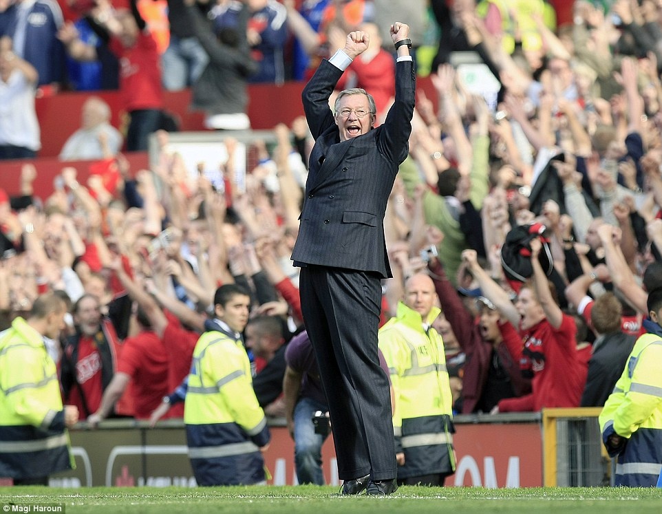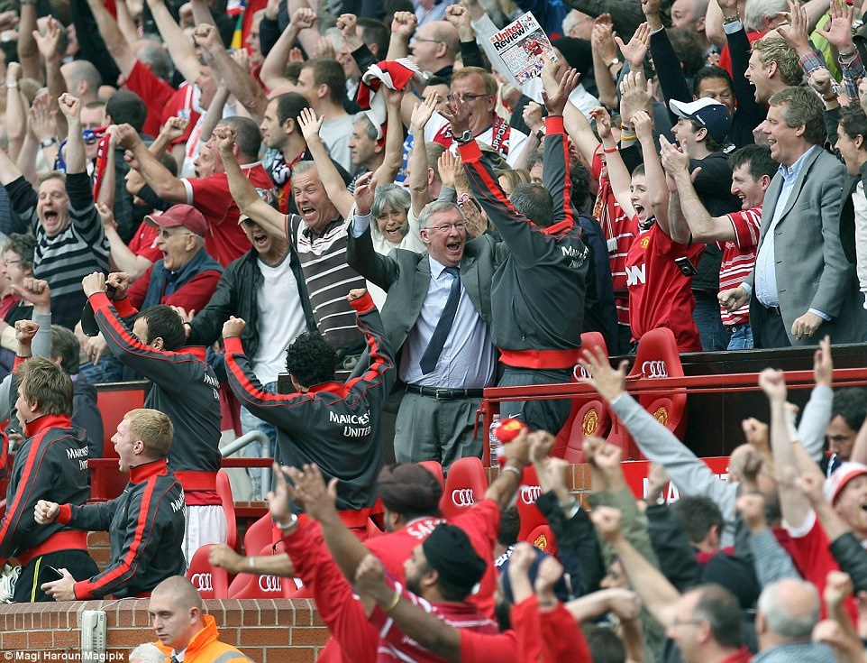 HLV huyền thoại của M.U hòa mình cùng các CĐV để ăn mừng chiến thắng của M.U trước Chelsea năm 2011.