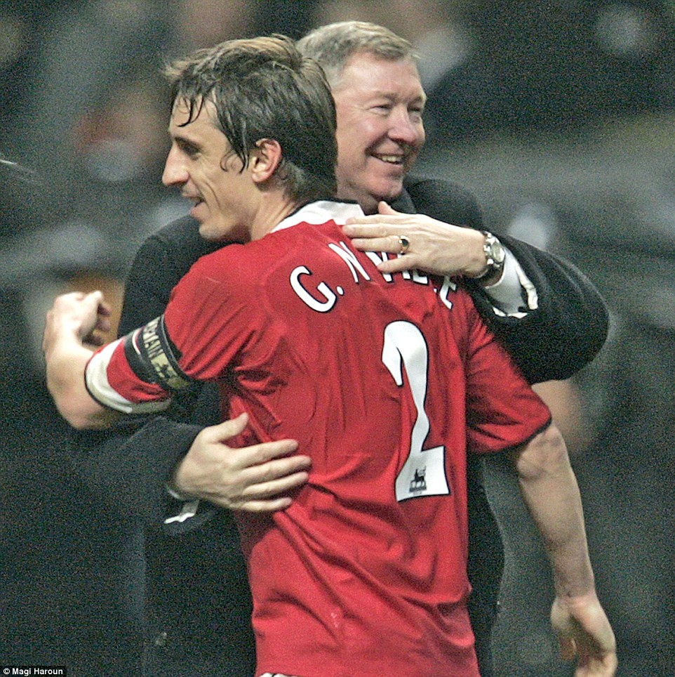 Fegie chúc mừng cựu hậu vệ Gary Neville sau khi M.U đánh bại Wigan 4-0 trong trận chung kết Carling Cup năm 2006.