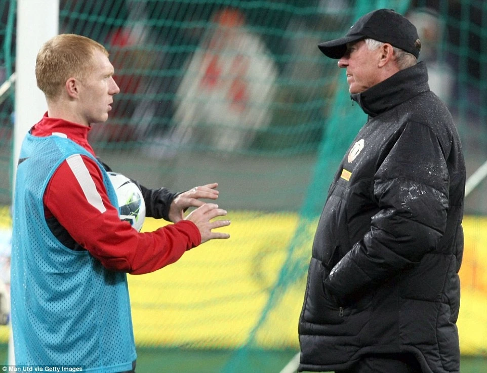 Sir Alex lắng nghe những chia sẻ của cựu tiền vệ Paul Scholes, một trong những học trò tài năng nhất dưới triều đại của ông, trong chuyến du đấu trước thềm mùa giải tại Nam Phi năm 2012.