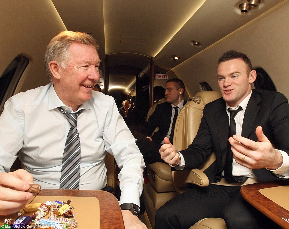 Sir Alex tươi cười với Wayne Rooney sau khi trở về anh từ Lễ trao giải Quả bóng vàng FIFA 2012, khi đó tiền đạo người Anh được bình chọn vào Đội hình tiêu biểu của FIFA.