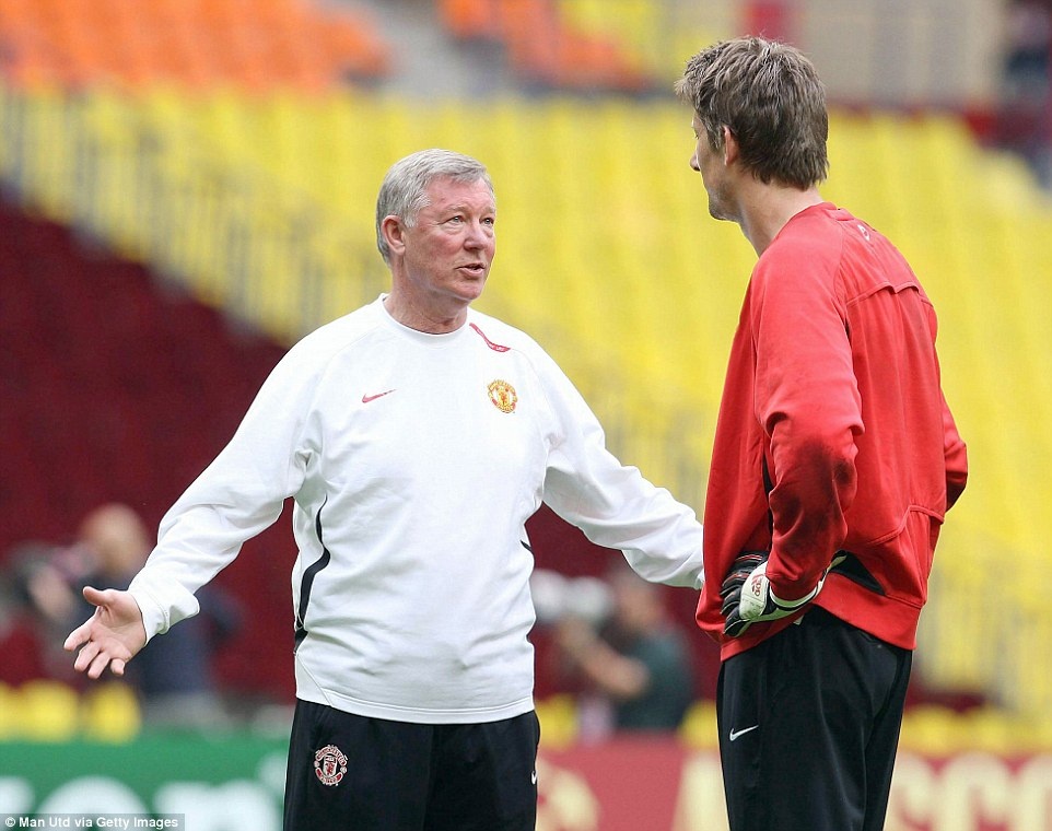 Sir Alex nói chuyện với cựu thủ thành Edwin Van Der Sar trước trận chung kết Champions League 2012, giải đấu mà thủ môn người Hà Lan được xem là người hùng trên chấm penalty.