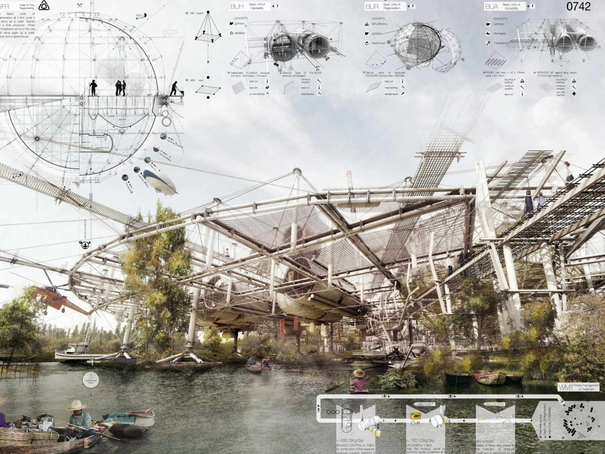 "Re-Generator Skyscraper" là dự án nhằm tài tạo các vùng bị ngập nước của Hangshou, Trung Quốc. Kiến trúc sư: Gabriel Munoz Moreno, Mỹ |