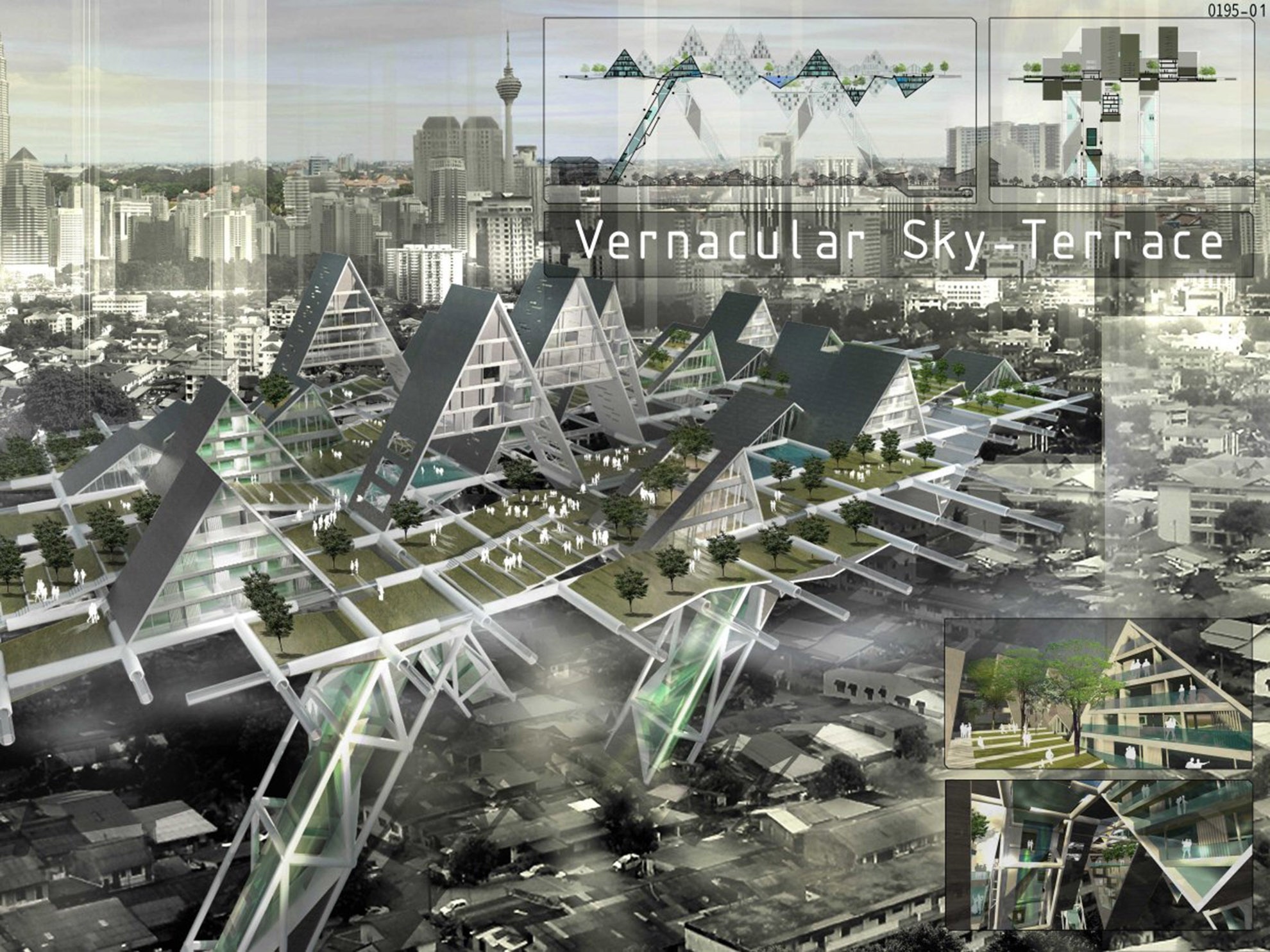 "Vernacular Sky-Terrace" là một cao ốc nằm ngang với thiết kế giống một con đường, nhằm tạo dựng một cộng đồng gần gũi, gắn bó. Kiến trúc sư: KHZNH Studio: Amir Izzat Adnan, Nur Farhanah Saffie, Malaysia |