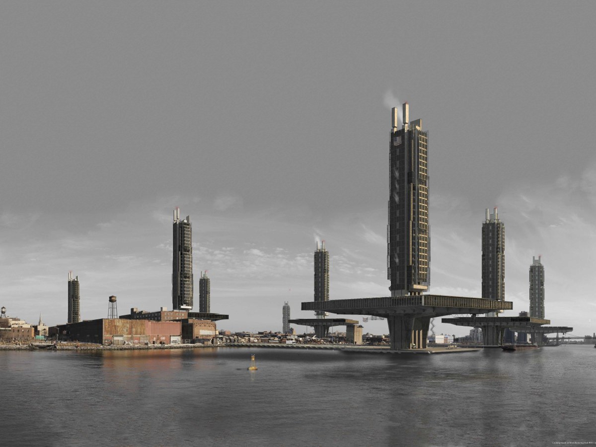 "Vertical Factories in New York" là công trình gồm 21 tòa tháp công nghiệp nằm dọc bờ biển Brooklyn. Ý tưởng này nhằm tái thiết lập nền kinh tế sản xuất của thành phố New York mà không ảnh hưởng tới đất đai. Kiến trúc sư: Stuart Beattie, Anh |