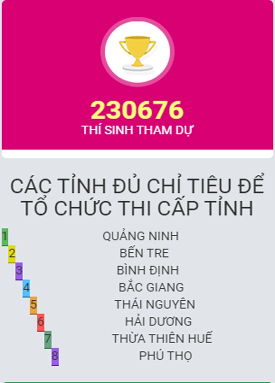 Quảng Ninh, Bến Tre, Bình Định, Bắc Giang, Thái Nguyên, Hải Dương, Thừa Thiên Huế, Phú Thọ là 8 trong 63 tỉnh thành đủ điều kiện tổ chức vòng thi cấp tỉnh của cuộc thi Chinh phục vũ môn. Các tỉnh này đã nỗ lực hết mình trong việc tuyên truyền và khuyến khích các em học sinh tham gia, đồng thời cũng là những tỉnh sở hữu các tay đua xuất sắc nhất. Vào ngày 19/4, các thí sinh đạt giải vòng thi toàn quốc sẽ được vinh danh trực tiếp trên sóng truyền hình ANTV. Đó sẽ là vinh dự và niềm tự hào lớn lao đối với bất cứ học sinh nào.