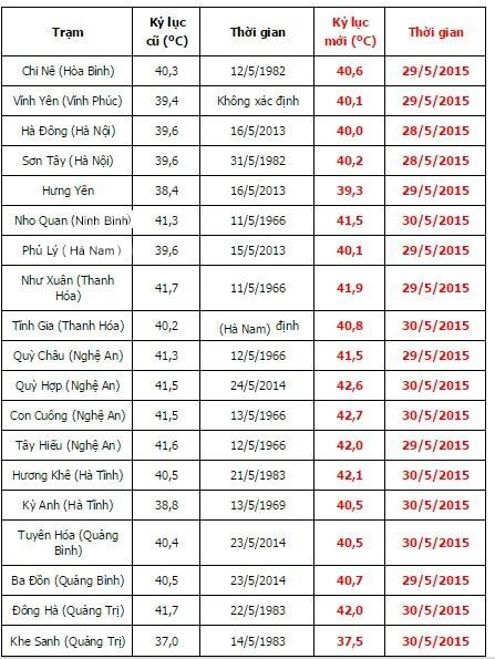 | Danh sách các trạm có nhiệt độ cao nhất ngày vượt ngưỡng lịch sử trong tháng 5/2015. Nguồn: NCHMF. |