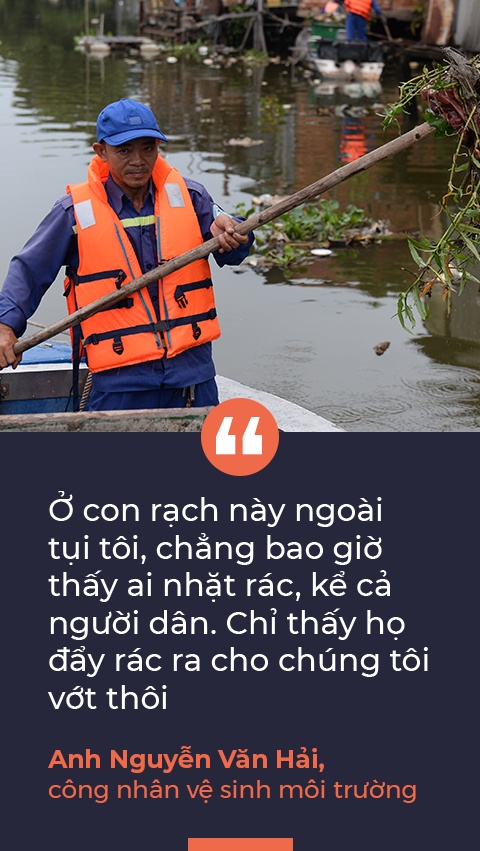 “Ở con rạch này ngoài tụi tôi, chẳng bao giờ thấy ai nhặt rác, kể cả người dân. Chỉ thấy họ đẩy rác ra cho chúng tôi vớt thôi. Không làm nhanh, đến lúc triều cường lên, rác lại đùn về các rạch nhỏ, ghe không vô đó để vớt được”, anh Hải nói.