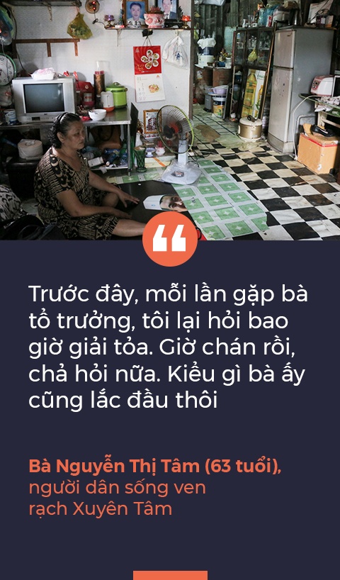 Nắm bắt tầm nhìn ấy, bà Lê Thị Thanh (65 tuổi) cùng cả gia đình tay xách nách mang lên tàu rời quê hương Thanh Hóa vào TP.HCM, hòa vào làn sóng nhập cư, tìm kiếm cơ hội ở một vùng đất mới với nhiều hứa hẹn về tiềm năng phát triển. Bà dùng toàn bộ gia tài lúc đó, gần 8 cây vàng, mua một căn nhà trong hẻm trên đường Điện Biên Phủ (quận Bình Thạnh), bên một nhánh của rạch Xuyên Tâm. Khi ấy, bà Thanh cùng gần 2.000 hộ dân sống ven con rạch không biết nơi này vừa được tái quy hoạch.