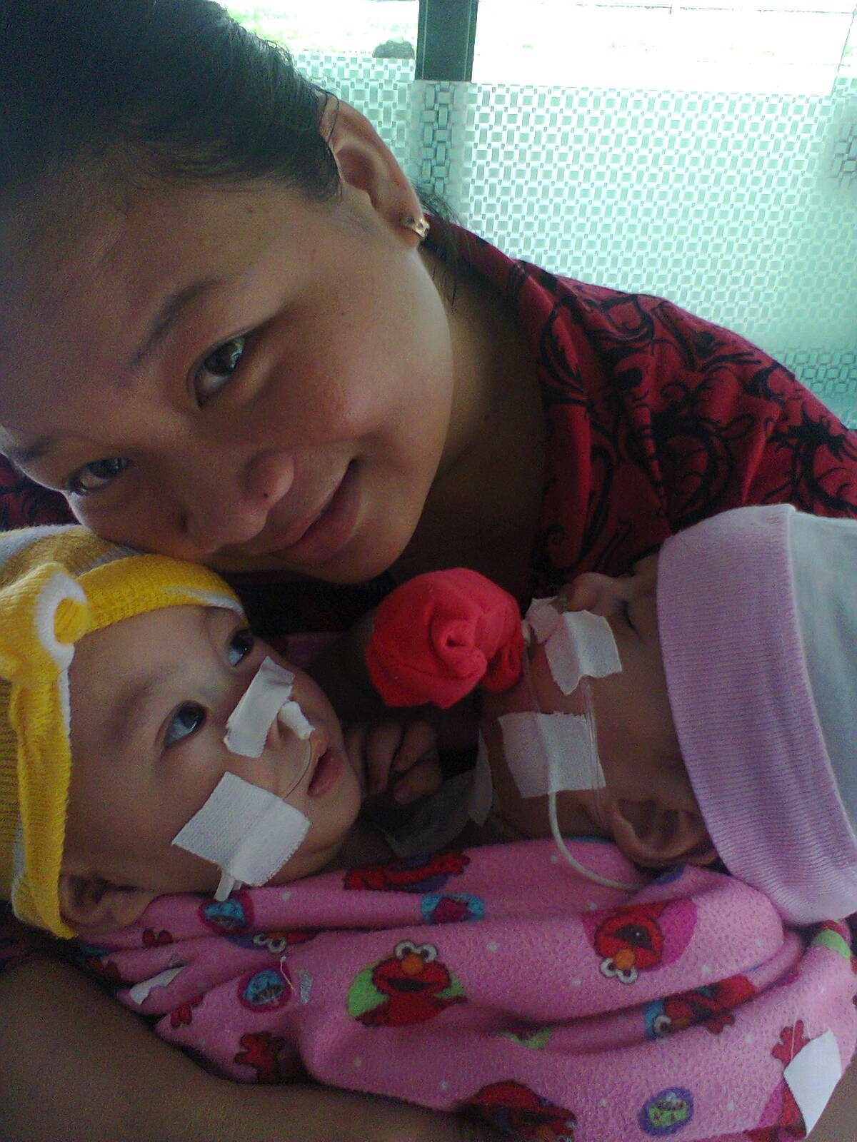 Từ khi sinh con ra đến tháng thứ 11 em mới được ôm con đúng một lần. Đó là khi đưa 2 cháu sang bệnh viện Hòa Hảo (Q.5) để xét nghiệm lần cuối trước khi phẫu thuật. Khi đó 2 cháu nặng 12 kg, thấy em cứ bế hoài, các bác sĩ bảo cho con nằm lên giường cho khỏi mỏi tay nhưng em cứ bế. Toàn bộ thời gian em được bế con khoảng 1 giờ đồng hồ".
