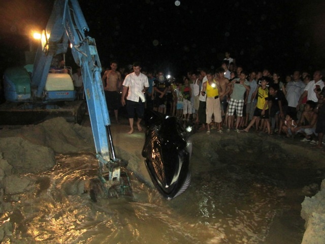 | Do cá voi khá nặng (gần 3 tấn) dài gần 8m nên anh Nam đã kêu gọi nhiều người dân đến để ứng cứu. Đồng thời chính quyền địa phương đã điều động 2 máy xúc khẩn trương ra hiện trường để giải cứu cho chú cá voi đang bị mắc cạn. |