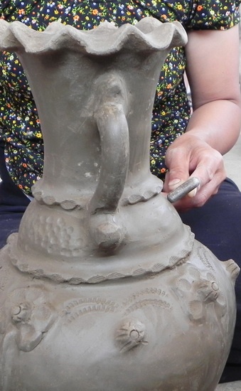 Các nghệ nhân chỉ dùng tay để tạo nên tác phẩm chứ không dùng bàn xoay. Vì thế, đường nét của sản phẩm không mềm mại, nhẵn mịn mà thô ráp, sần sùi. Ảnh: Linh San.