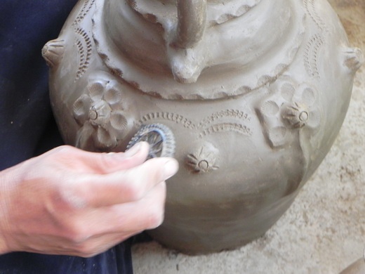 Hoa tiết, hoa văn trên gốm thường được tạo hình từ muỗng, nắp chai, bánh xe đồ chơi trẻ em, vỏ sò, hoa văn thực vật, móng tay.... Song qua bàn tay khéo léo của người thợ, những họa tiết trên trở nên mềm mại, có sức sống. Ảnh: Linh San.