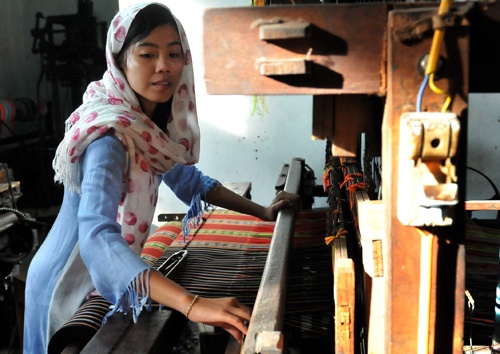 Để hội nhập và phát triển, hiện, những chiếc máy dệt cho năng suất cao hơn đang dần thay thế công cụ dệt tay. Họa tiết, hoa văn và sản phẩm làm từ thổ cẩm cũng phong phú hơn để phù hợp với thị hiếu c ủa người dùng. Ảnh: Thanh Hà/TTXVN.
