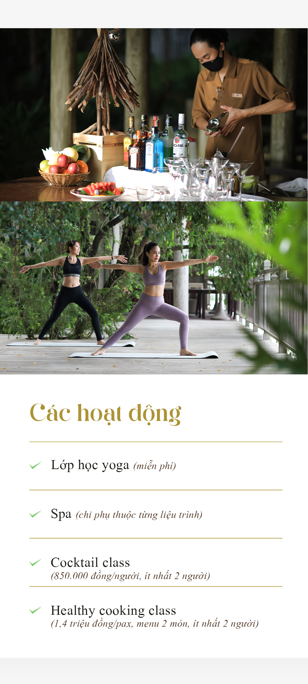 Với quỹ thời gian 2 ngày cuối tuần ít ỏi, tôi chọn một khu nghỉ dưỡng cách TP.HCM chưa đầy 15 km. Khác những chuyến staycation trước chỉ nằm dài trong phòng, kỳ nghỉ lần này của tôi sẽ được lấp kín với những hoạt động như học nấu ăn thực dưỡng, tập yoga buổi sáng, học làm cocktail...