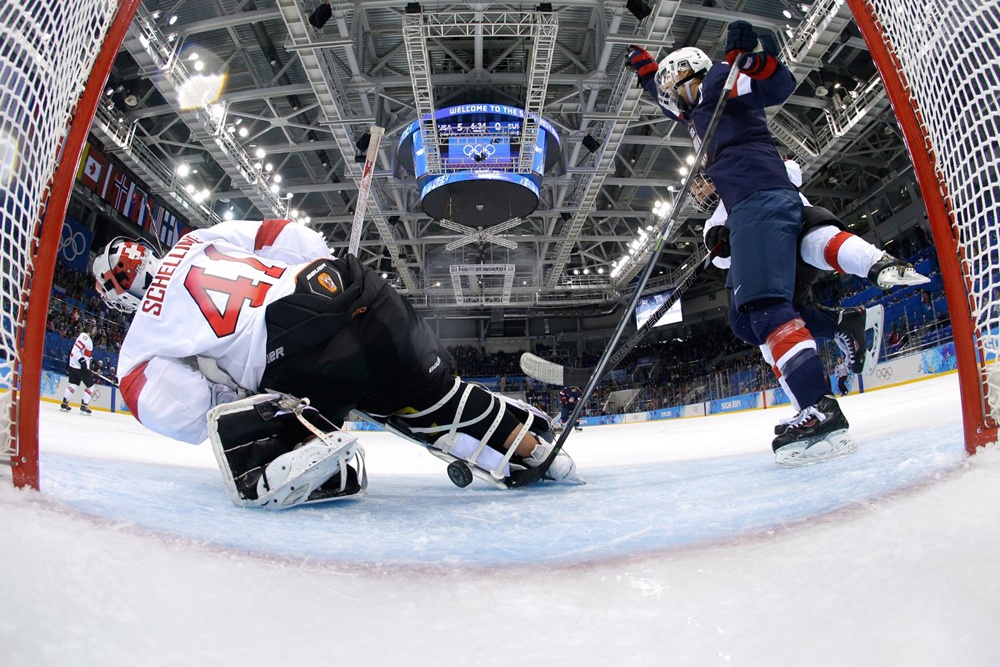 | Một trận hockey trên băng nhìn từ khung thành. |