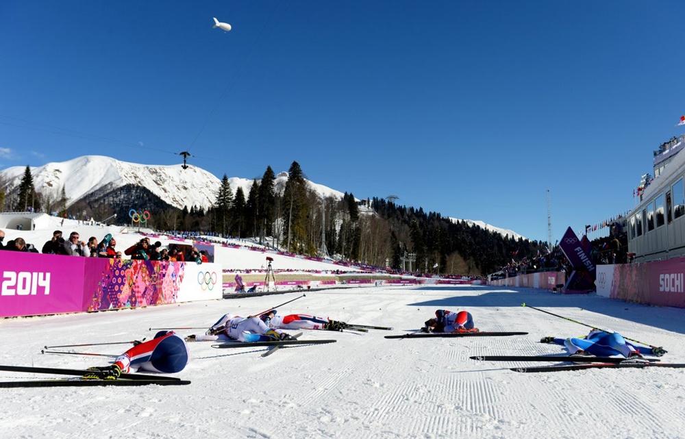 | Hàng loạt vận động viên trượt tuyết đổ gục sau khi cán đích. |