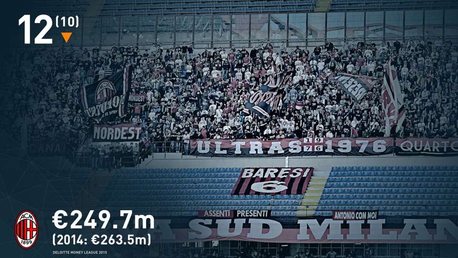 Đây là lần đầu tiên AC Milan bị đánh bật ra khỏi Top 10 CLB kinh doanh tốt nhất mùa giải, tổng doanh thu giảm 5% so với mùa trước nữa. Tiền bản quyền truyền hình giảm 13%, xuống còn 122,7%. Hoạt động kinh doanh trong các trận đấu đạt 24,9 triệu euro (10%).