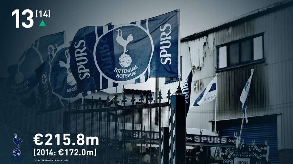 Tottenham tăng trưởng 22% so với mùa 2012/13, nhờ đó họ tiến thêm một bậc trong danh sách này. Hoạt động kinh doanh trong các trận đấu đạt 52,5 triệu euro (24%), trong khi các bản hợp đồng tài chính đem lại 50 triệu euro (23%), số còn lại đến từ bản quyền truyền hình.