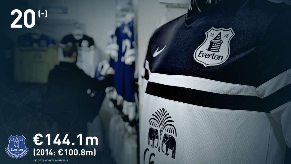 Đây là lần đầu tiên sau 18 năm, Everton có mặt trong danh sách 20 CLB làm ăn tốt nhất mùa. Trong 144,1 triệu euro tổng doanh thu, tiền bản quyền truyền hình đạt 73% (144 triệu).