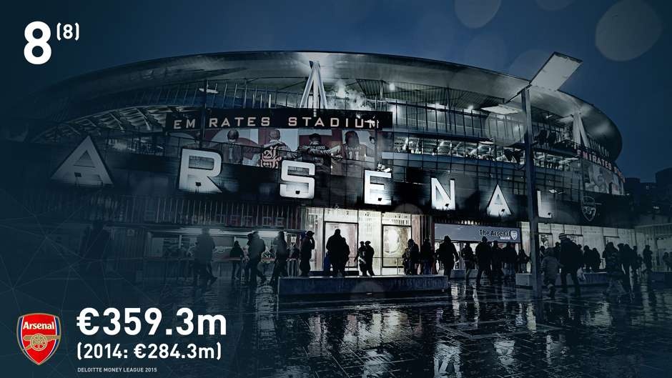Dù vẫn đứng thứ 8 so với cùng kỳ năm ngoái, Arsenal lại tăng trưởng rất mạnh nhờ giành một vị trí trong Top 4 và lọt vào vòng 1/8 Champions League. Doanh thu từ các trận đấu tăng 8%, đạt 119,8 triệu euro, trong đó tính cả chặng đường tới ngôi vô địch FA Cup. Trong khi đó, công việc kinh doanh của The Gunners tăng 24%, đạt 92,2 triệu euro.