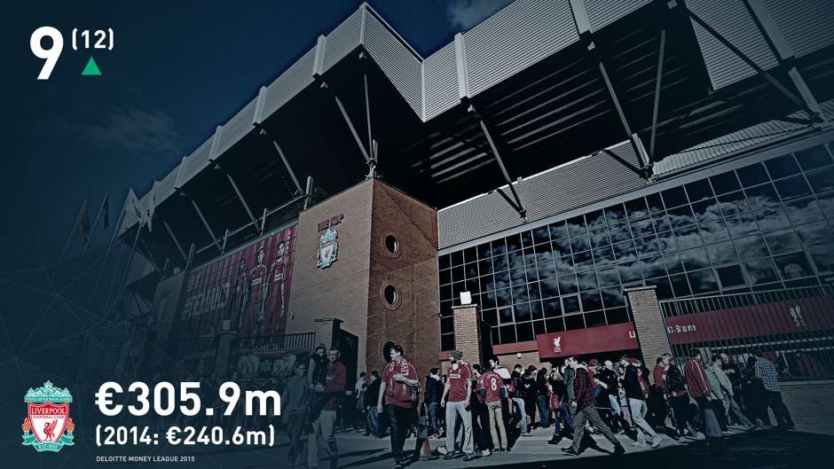 Liverpool lọt vào Top 10 và tăng 24% tổng doanh thu so với cùng kỳ năm ngoái là nhờ trải qua mùa giải ấn tượng nhất kỷ nguyên Premier League (cán đích vị trí thứ 2). Khoản tiền mà The Kop nhận được từ bản quyền truyền hình là 120,8 triệu euro, trong khi công việc kinh doanh mang về 124,1 triệu euro.