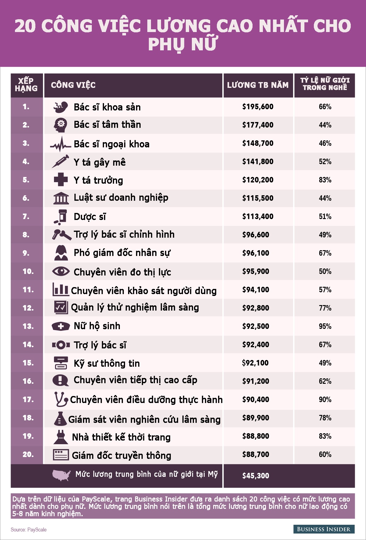 Các nghề liên quan tới chăm sóc sức khỏe, thiết kế, sáng tạo... là những công việc mức lương cao nhất cho phụ nữ, theo báo cáo mới đây của PayScale.