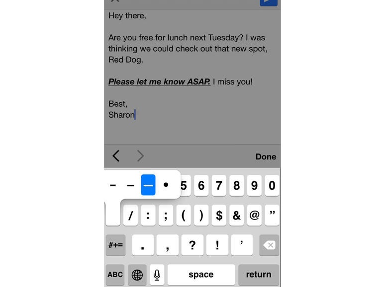 Trong một số ứng dụng như Mail, người dùng có thể tô đậm, in nghiêng hay gạch nhân ký tự. Để làm điều này, chọn đoạn văn bản rồi giữ cho đến khi cửa sổ cắt/dán hiện lên, nhấn vào mũi tên rồi chọn tiếp định dạng. |