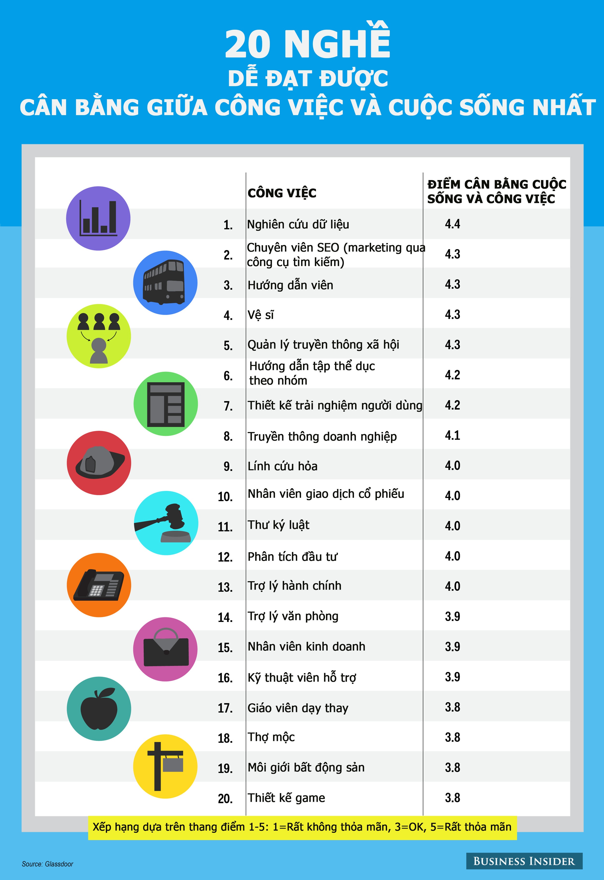 Dựa trên nghiên cứu của trang việc làm Glassdoor, Business Insider đưa ra 20 nghề có thể đạt được sự cân bằng giữa công việc và cuộc sống dễ dàng nhất. Theo thang điểm 5 của nghiên cứu trên, nghề nghiên cứu dữ liệu được xếp hạng cao nhất với điểm số 4,4, theo sau là chuyên viên SEO với 4,3 điểm.