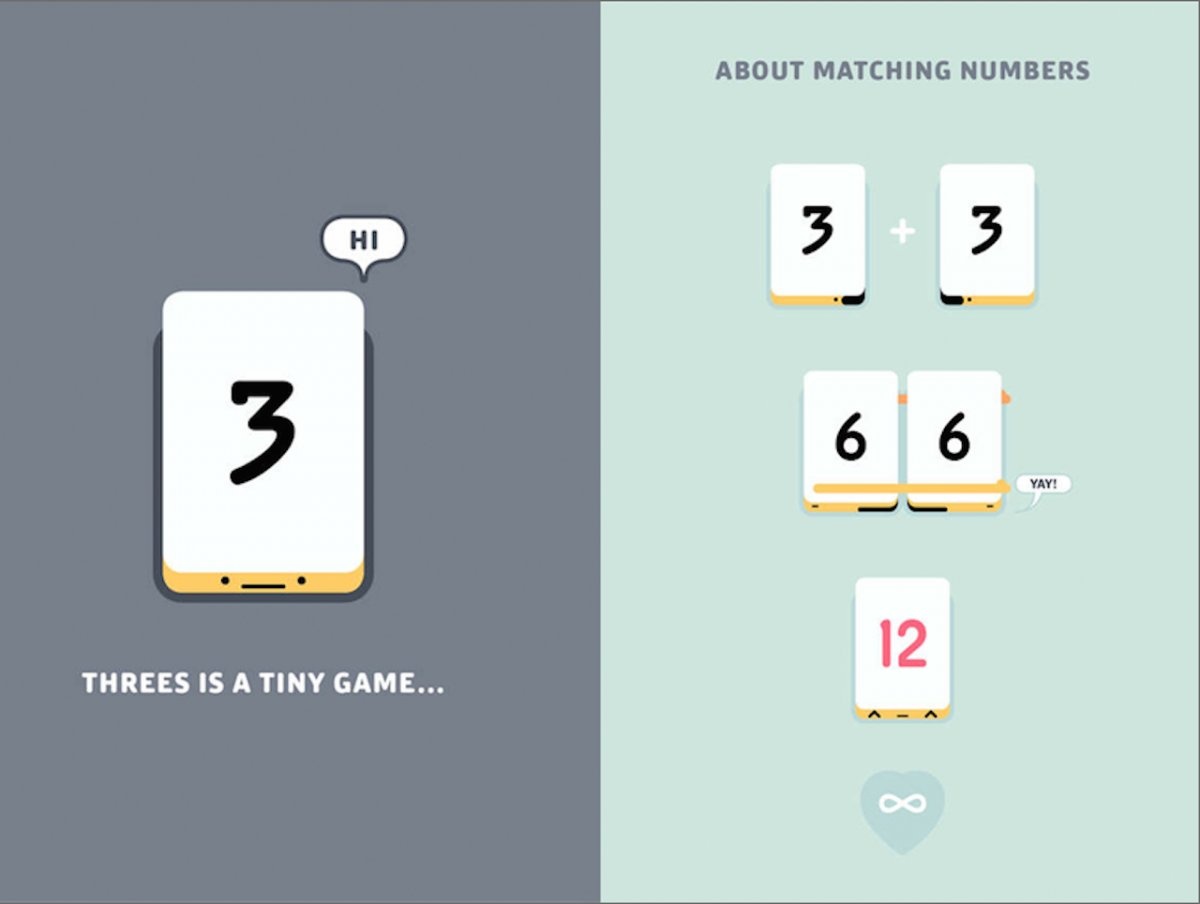 Threes là một trò chơi trí tuệ và đơn giản. Ý tưởng cơ bản của tựa game này là bạn có một khối số "1" và một khối số "2", trộn chúng với nhau, và bạn có kết quả là một khối số “3”. Lặp lại tương tự để tạo ra khối số “6”, trộn hai khối số “6” vào để được khối số “12”. Quá trình chơi cứ thế lặp lại tiếp diễn.