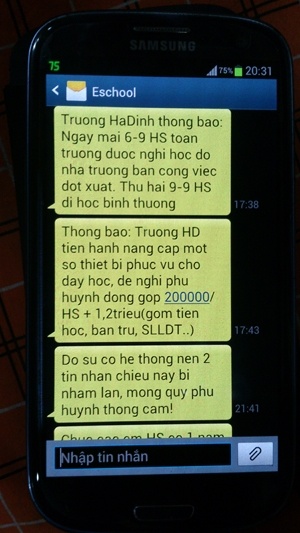 Tin thứ hai được gửi sau đó khoảng 10 phút, có nội dung: “Trường HD tiến hành nâng cấp một số thiết bị phục vụ cho dậy học, đề nghị phụ huynh đóng góp 200.000/HS + 1,2 triệu (gồm tiền học, bán trú, SLLDT...)”.
