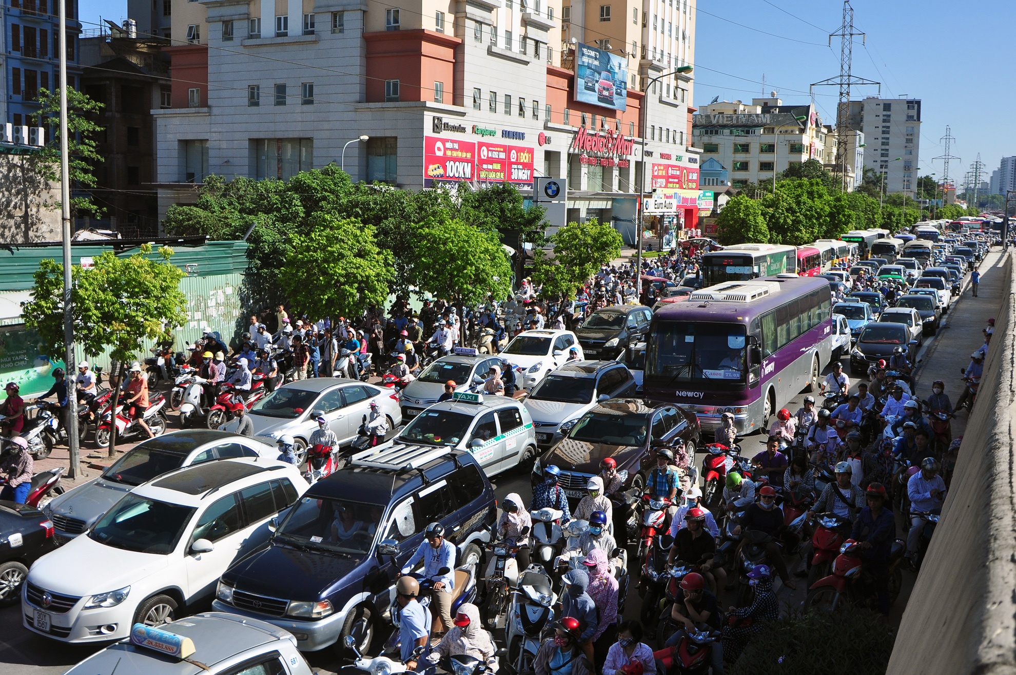Đường Phạm Hùng, đoạn gần khu vực Bến xe Mỹ Đình bị tắc nghẽn giao thông ngay từ 8h sáng.