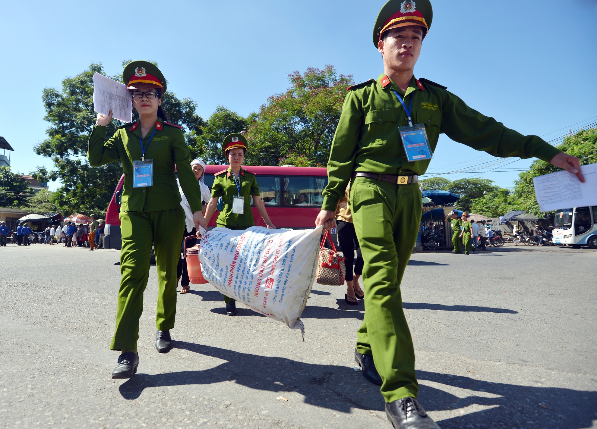 Ngoài việc đảm bảo trật tự, an ninh tại bến xe, những người mặc trên mình bộ sắc phục ngành an ninh còn hỗ trợ phụ huynh, sĩ tử khênh vác nặng trong thời tiết nắng nóng.