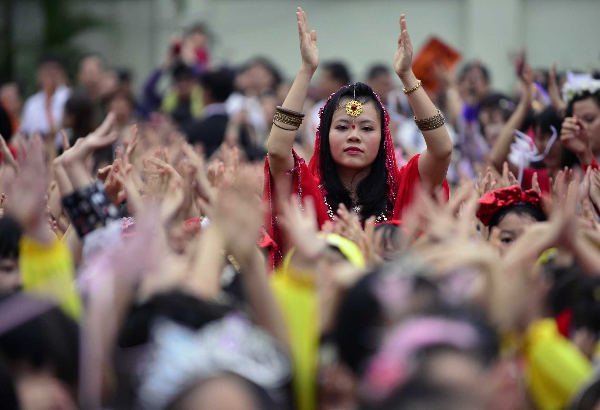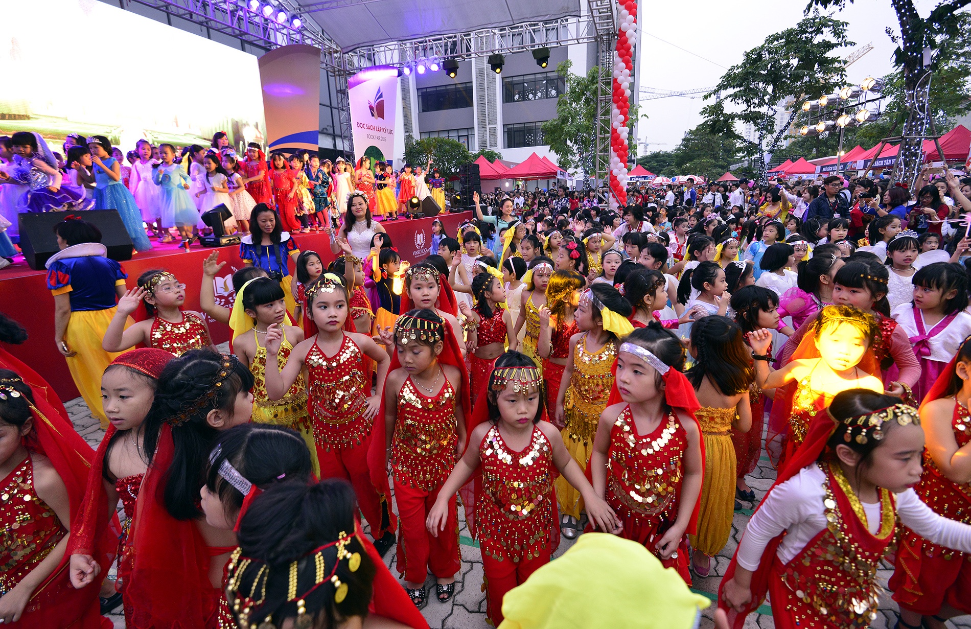 | Sau buổi diễu hành, gần 2.000 học sinh tập trung ở sân khấu nhảy múa theo nội dung các câu chuyện để ban giám khảo chấm điểm, trao giải. |