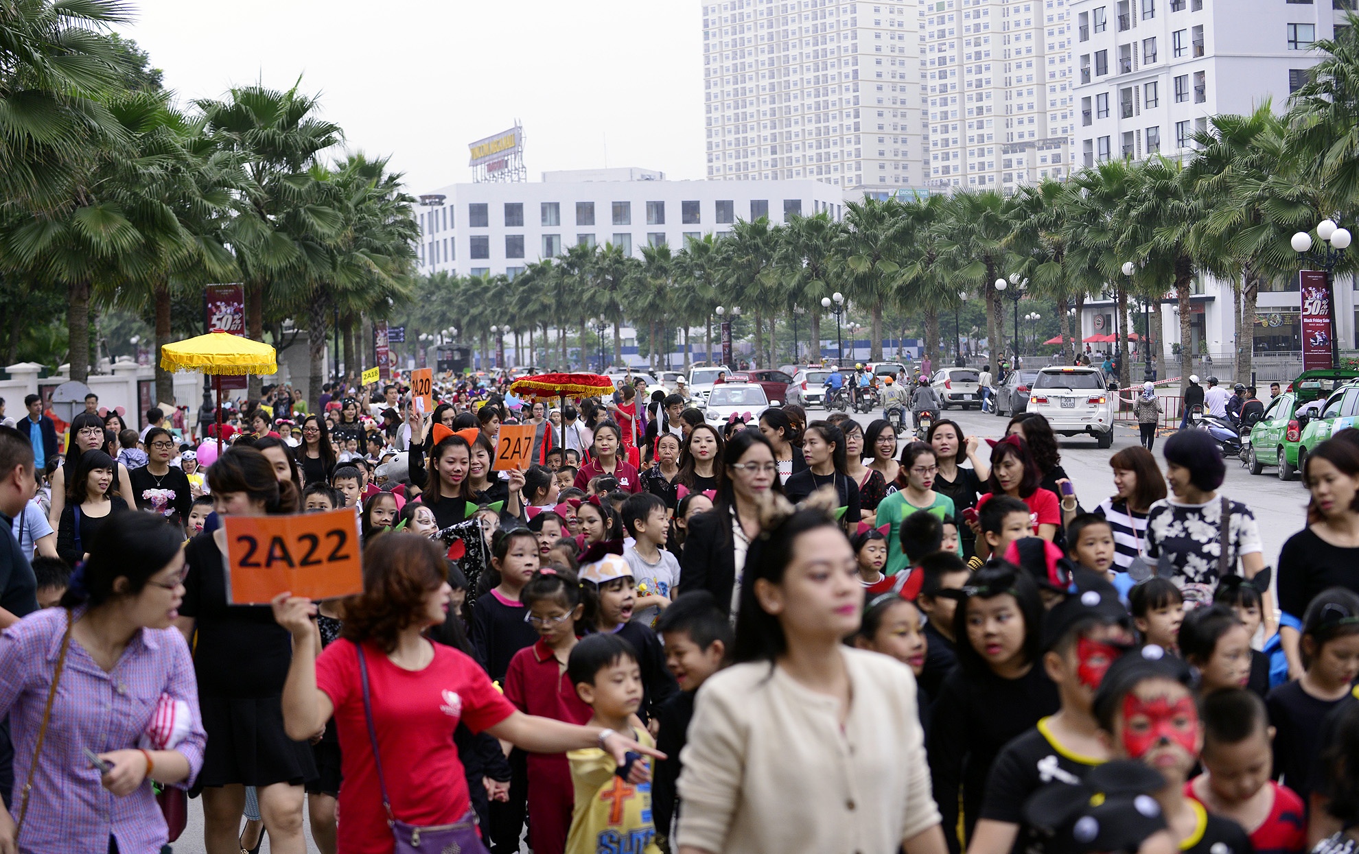 | Đoàn diễu hành gần 2.000 học sinh, chia thành các khối, lớp đi qua khu đô thị Time City. |